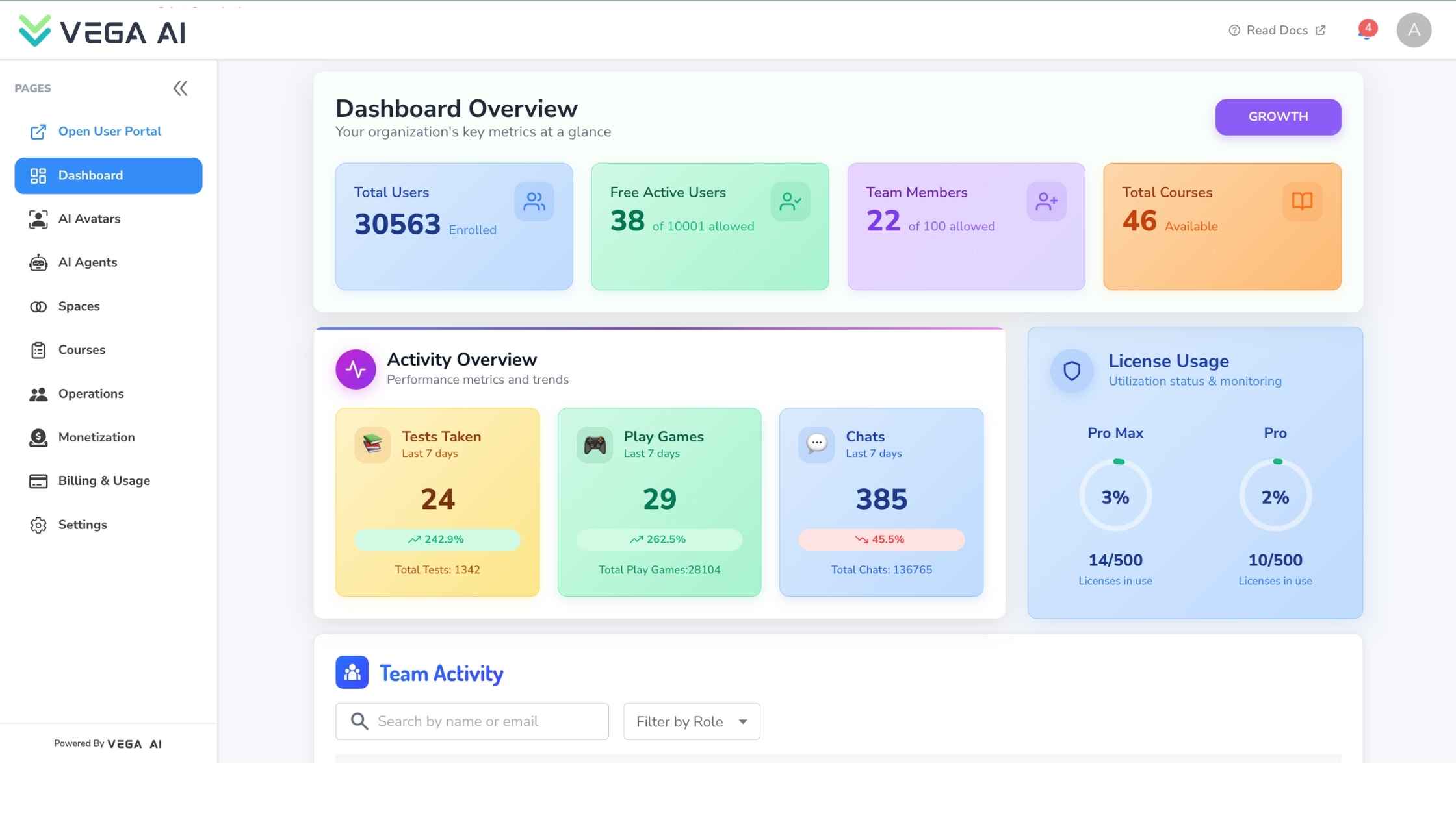 VEGA AI: AI-driven dashboards with accuracy, speed, error patterns, completion, and intent per person and cohort so you see who’s stuck, who’s ready to buy, and why.